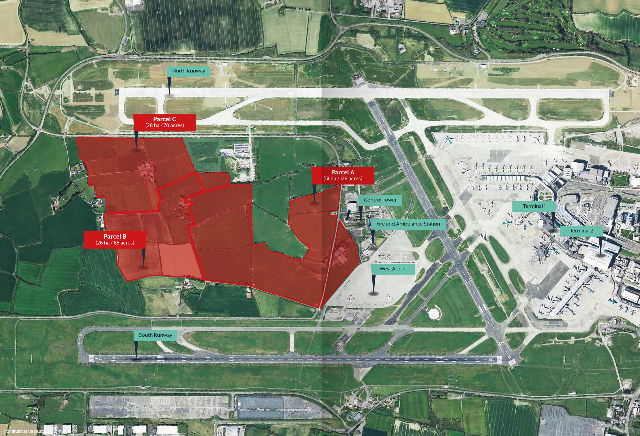 These unique lands, in the context of both Ireland and Europe, are at the heart of Dublin Airport and will be vitally important to any significant future development of the airport. A number of key stakeholders including the Department of Transport, the Dublin Airport Authority (DAA) and Fingal County Council (Local Authority) have alluded to the lands being a preferred location for a third airport terminal as capacity levels have been exceeded in recent years. The property comprises greenfield development lands, irregular in shape and predominantly in agricultural use, extending to a total area of approximately 106 ha (261 acres). The lands, which are zoned for “DA / Dublin Airport use”, are bound by the Dublin Airport apron to the east, the original runway to the south, a new (2022) second runway to the north and greenfield lands to the west. The surrounding area benefits from an excellent road network including the M50, M2 and M1 motorways. The lands generally have a level topography throughout and include two farm houses and several farming outbuildings which can be provided with Vacant Possession at short notice. The lands are available for sale in three separate parcels or in its entirety per the aerial image below and map overleaf. |
